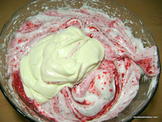 7-Agregamos a este merengue las frutillas procesadas y la crema. Unimos bien todo. Colocamos papel manteca en la base del molde y ubicamos sobre él una capa de pionono.